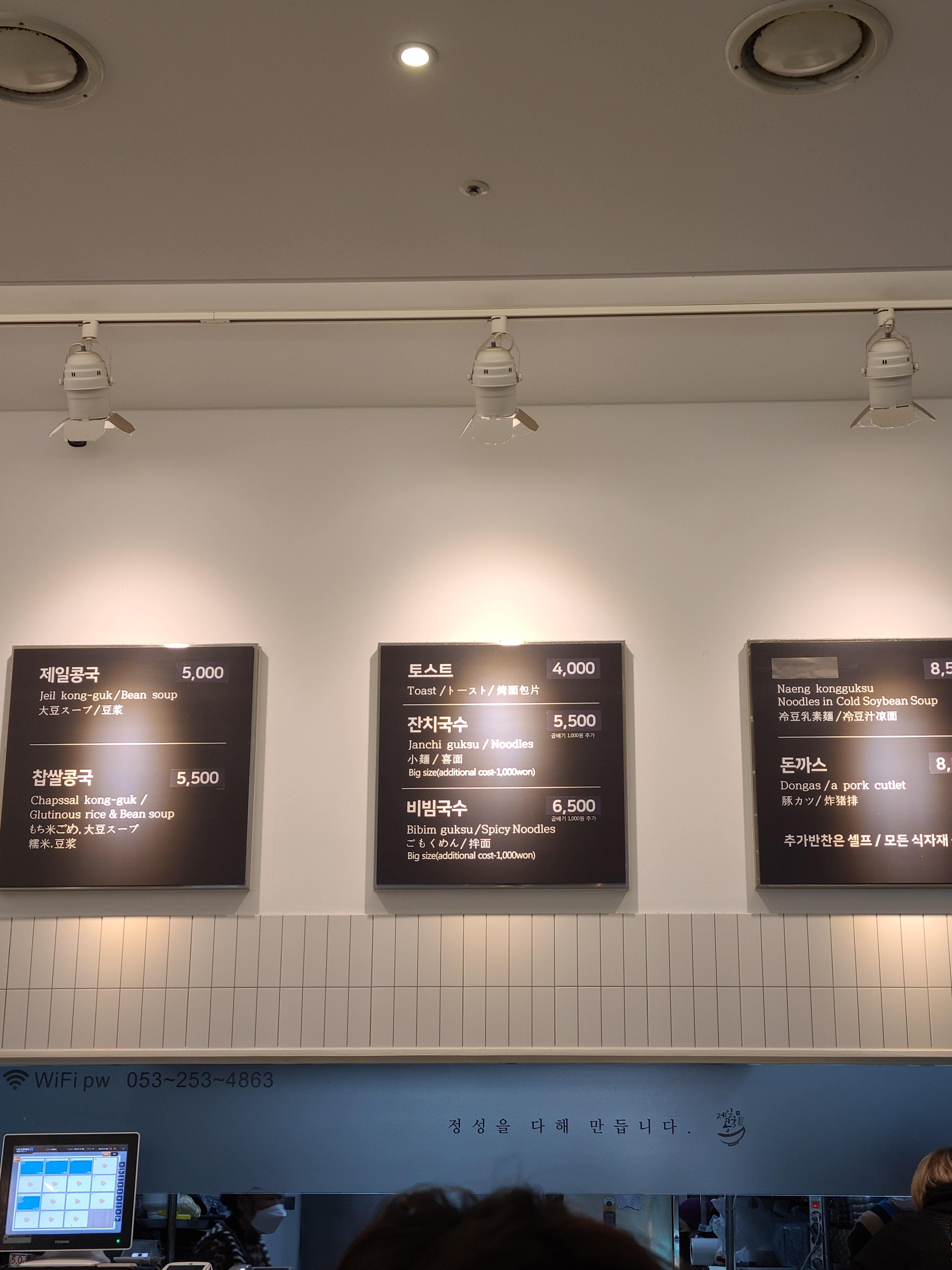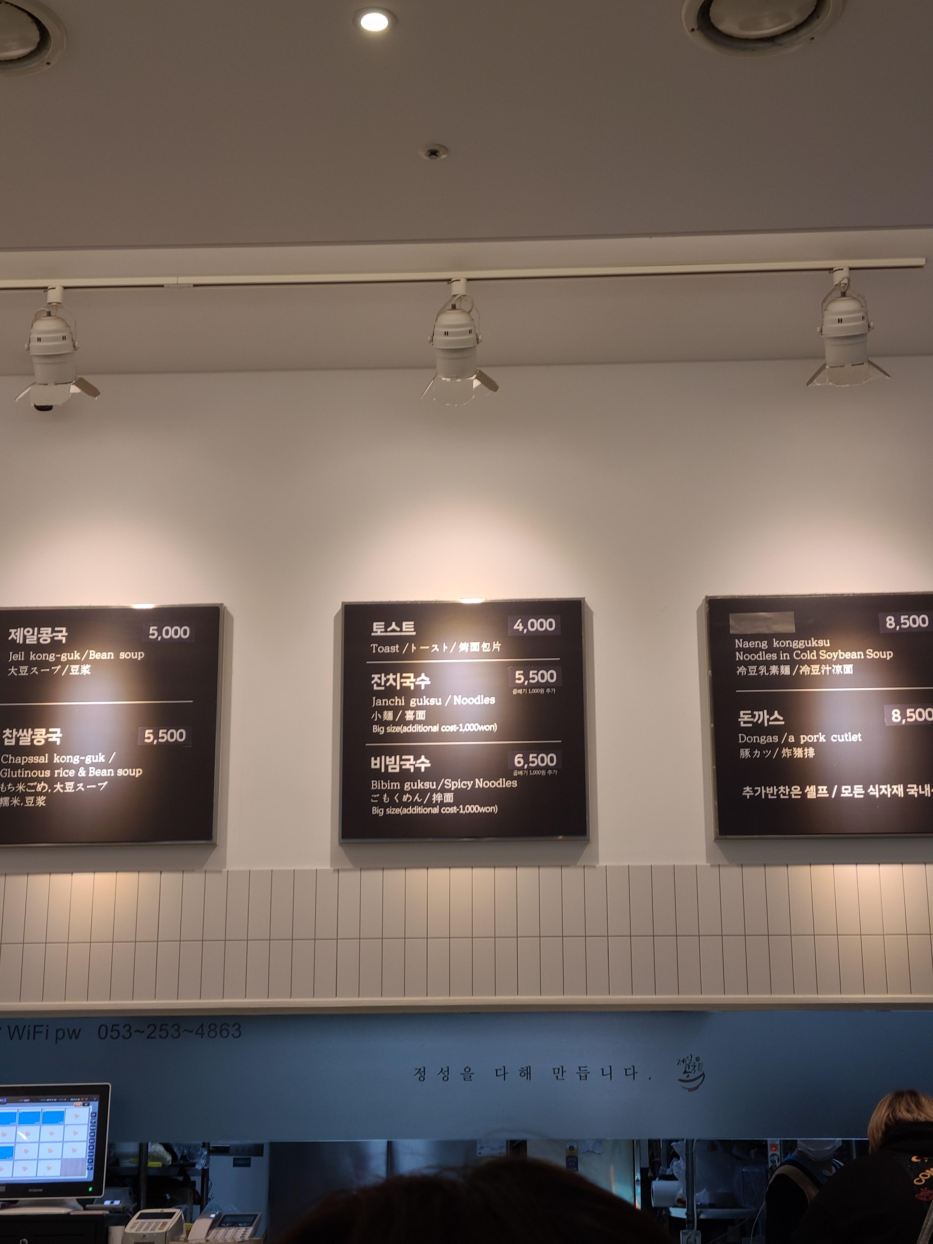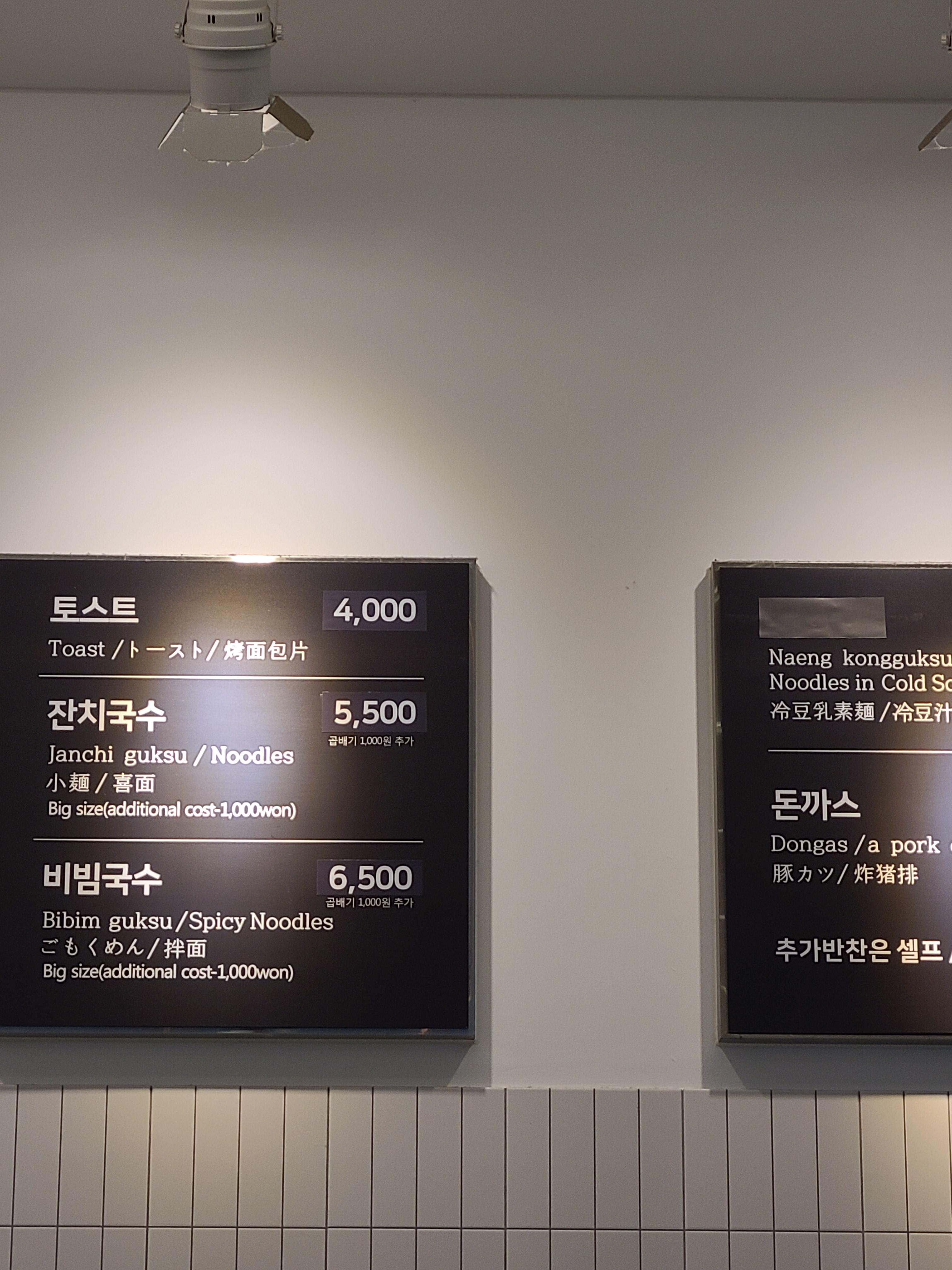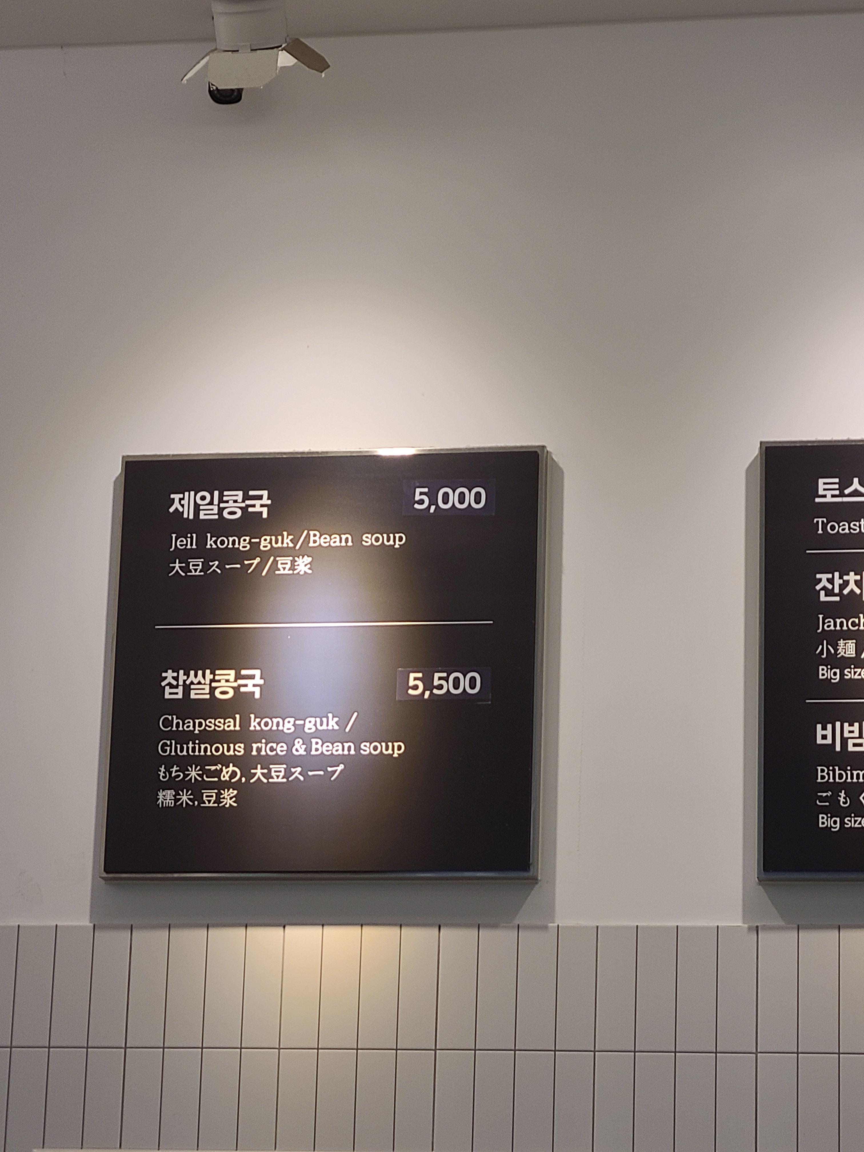 제일콩국은 5000원, 찹쌀콩국은 5500원, 토스트 4000원, 잔치국수 5500원, 비빔국수 6500원, 돈가스 8500원이에요.